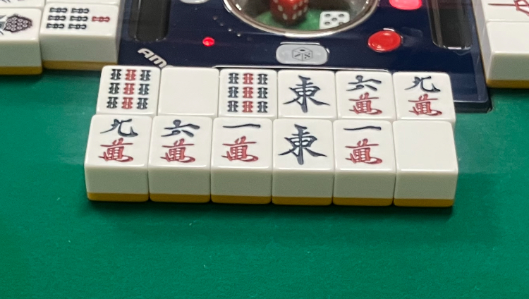 2段目の六萬を切ったところでザワワッとし、次順に一萬ツモ切りでホッと(?)胸を撫で下ろしたのも束の間、東が上下綺麗に並ぶと嫌な予感est⤴️