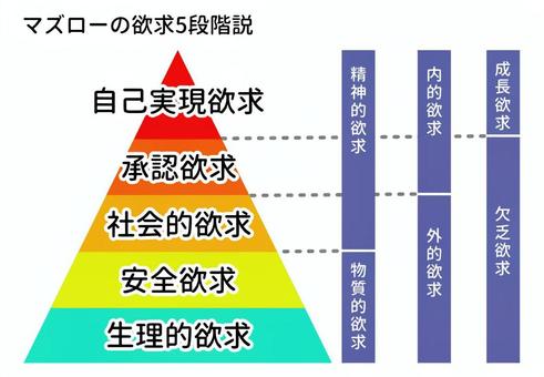 人間の欲求は5段階のピラミッドで構成され、下の欲求が満たされると上の欲求が現れるという理論です。