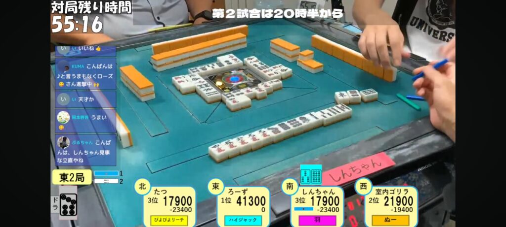 2戦目は唯一の連闘となった羽のしんちゃんがトップ!チームを首位に押し上げました!初日最下位だったはずでしが、あっという間にでしたね。一発の跳満ツモが見事でした!