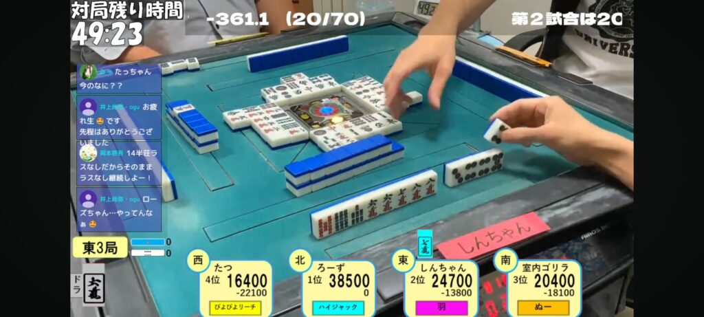 3着は羽のしんちゃん選手!トップいけるかと言う感じの展開でしたが後一歩が足らずでした😢ドラメンツを作っての和了は見事でした!