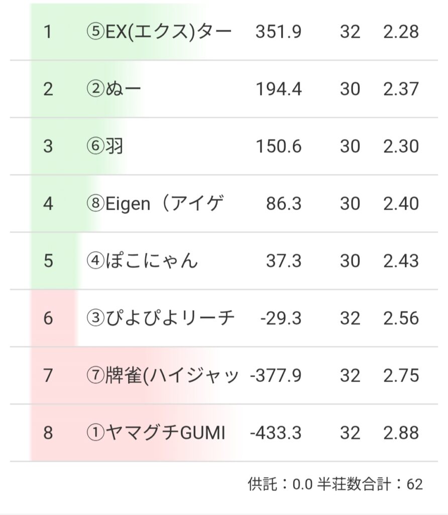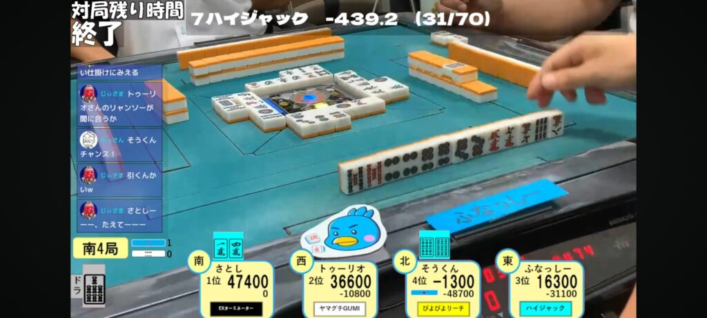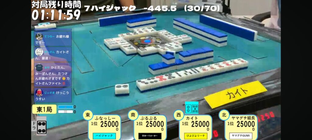 始まりは12000のダマテンに放銃スタートのふなっしー選手でしたが、1戦目を2着でまとめ