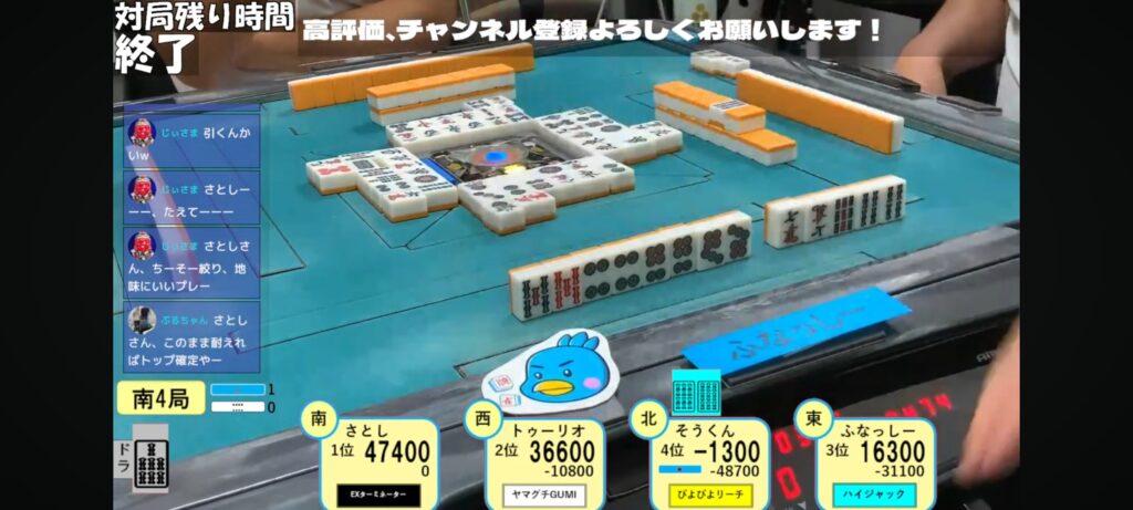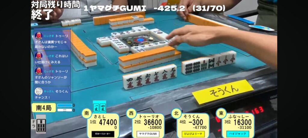 同卓者はたまったもんじゃないかも知れませんが皆で作った芸術作品に近いものがありますよね。鳴いて逃げ切り図るさとし選手、しっかりリャンメンリーチのそうくん選手、マンツモ目指して面前進行のトゥーリオ選手。皆が真剣に打ってるからまた輝く和了だったと思います✨